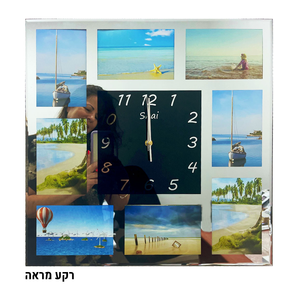 השעון עם מחוגים בהירים והוא בצורת מלבן עם מקום ל- 8 תמונות בגודל 10X15 ס"מ.
